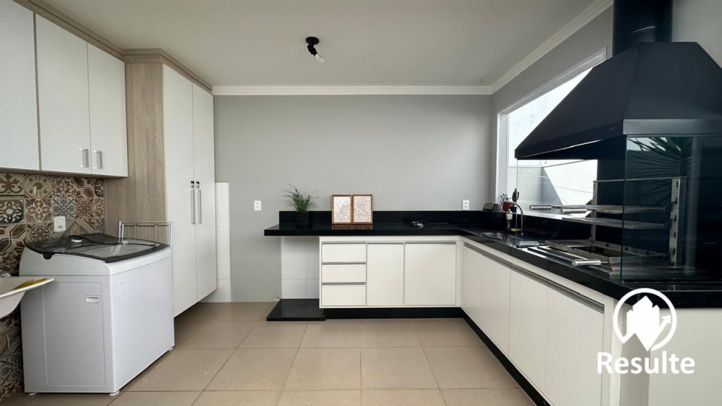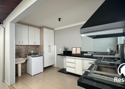 Área de lazer completa com lavabo, móveis planejados, cooktop, churrasqueira e pia