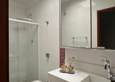 Banheiros com armários, box, espelhos e chuveiros instalados