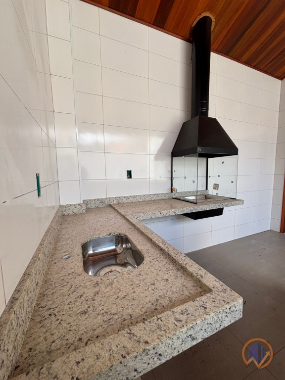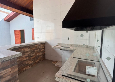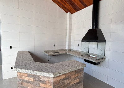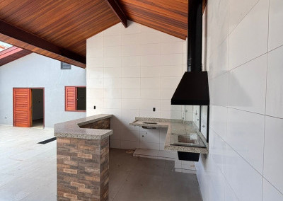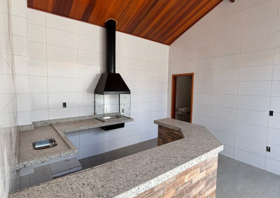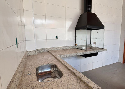 Espaço gourmet amplo com churrasqueira, pia, balcão e banheiro